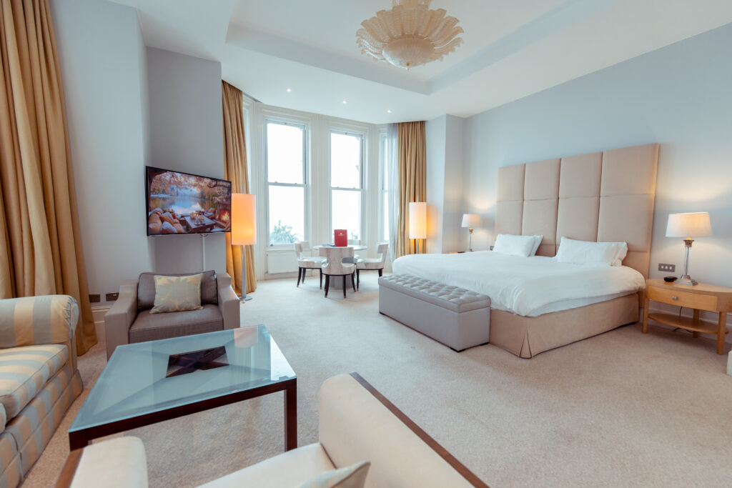 Spacious and indulgent, featuring an Emperor bed, sea views, dining area, sofa bed, Smart TV, and a luxurious bathroom with jacuzzi bath and rain shower.